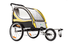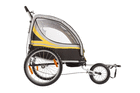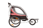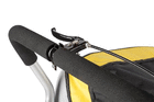 Главным отличием прицепа является, конечно же, наличие собственных амортизаторов, делающих поездку комфортной и беззаботной. Специальная конструкция со съемной ручкой и наличие дополнительного переднего колеса позволят использовать его, как обычную коляску.
