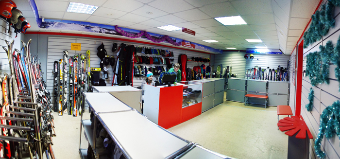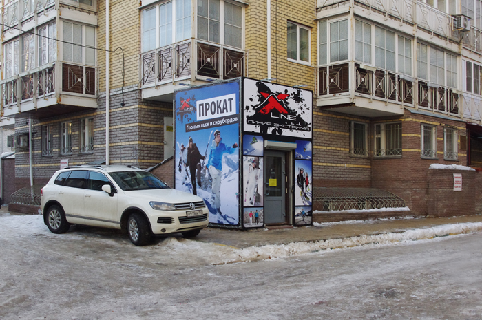 За ним увидите большую вывеску «Прокат горных лыж и сноубордов»: