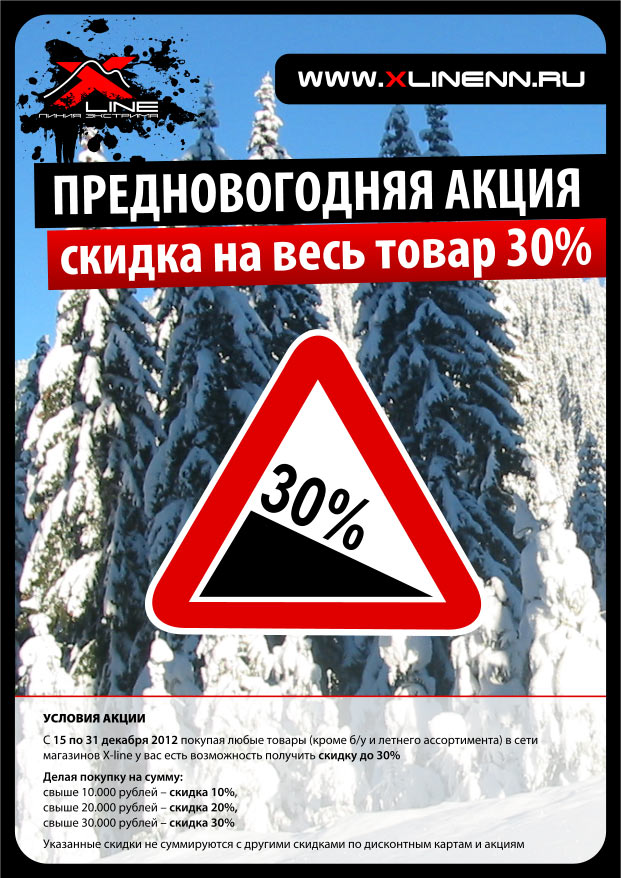 С 17 по 31 декабря 2012 покупая любые товары (кроме б/у и летнего ассортимента) в сети магазинов X-line у вас есть возможность получить скидку до 30%