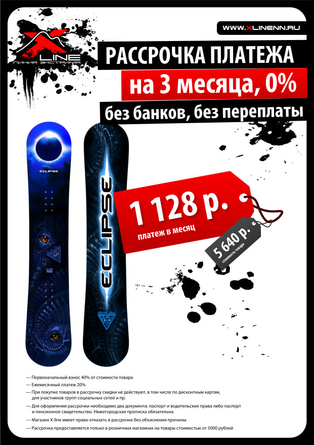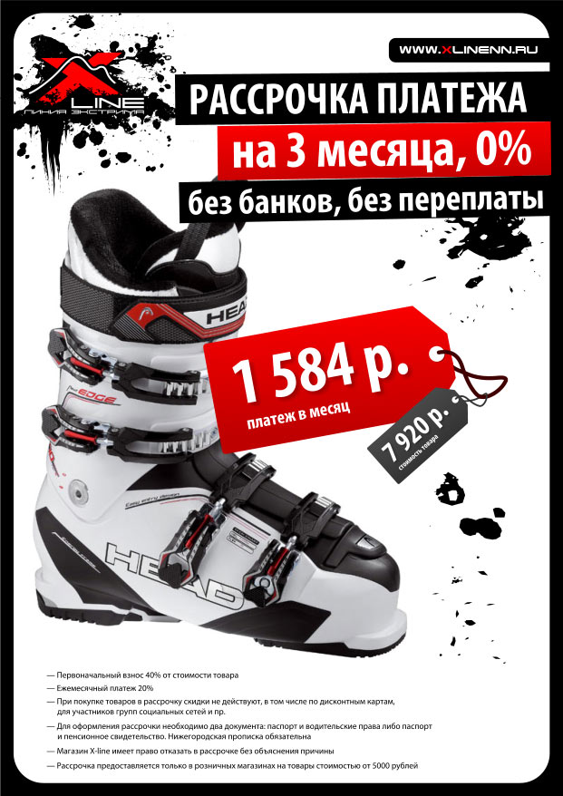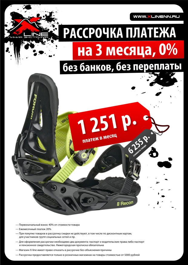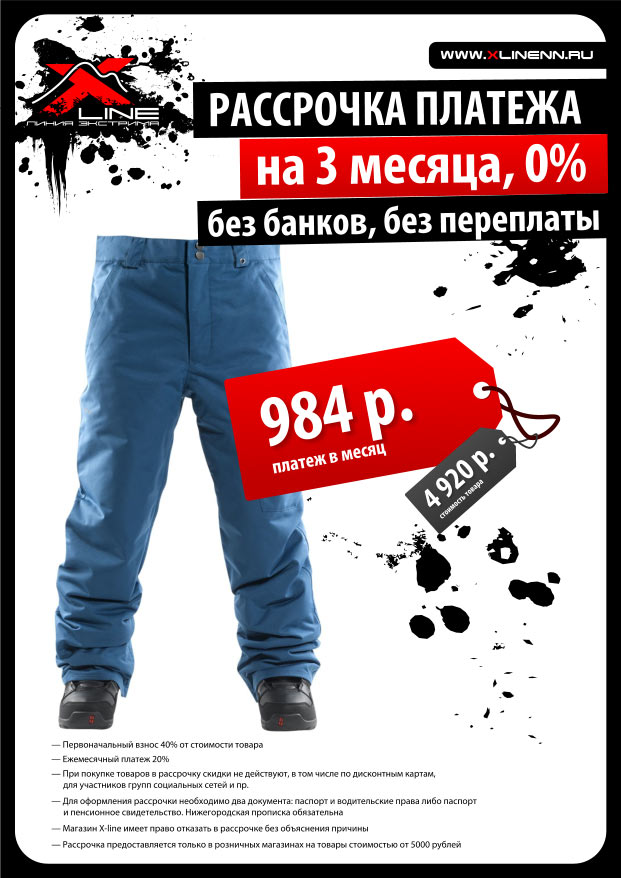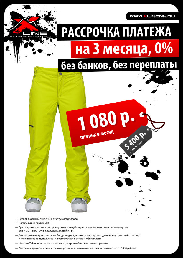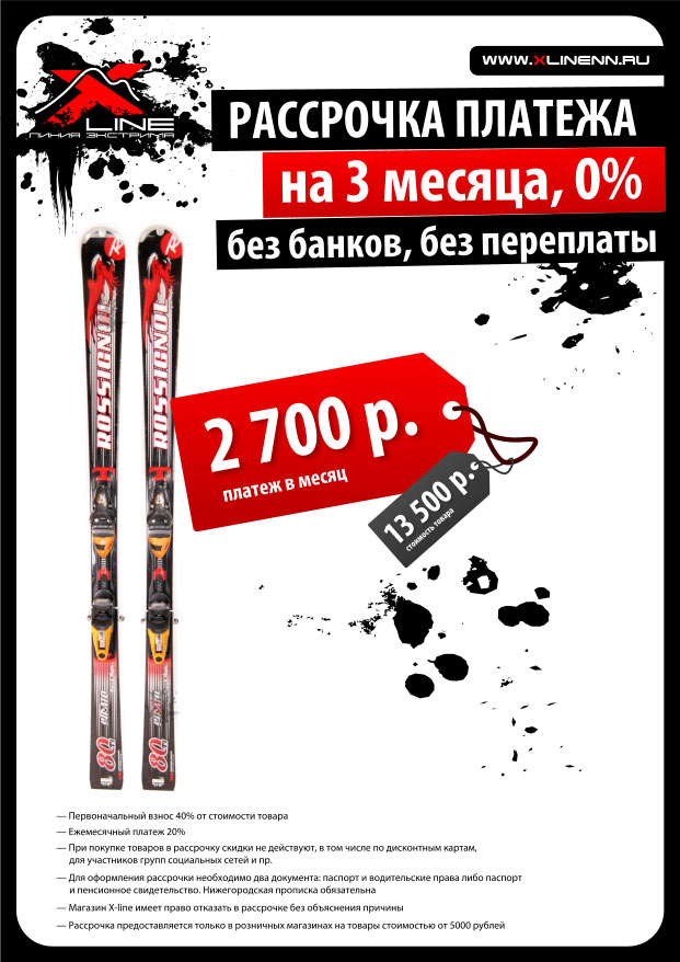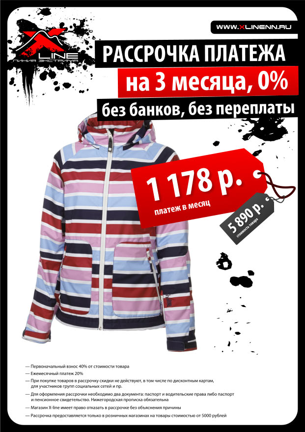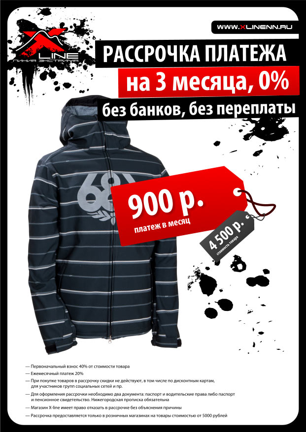 С 11 января 2013 стартует новая акция — рассрочка платежа на 3 месяца с переплатой 0% от магазина X-line (без участия банка). Первый взнос по рассрочке составляет 40%, а остальные – по 20%.